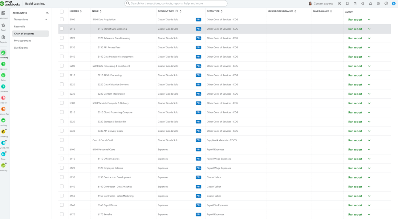 General Ledger: a tab that automatically connects to our General Ledger from QuickBooks (using the G-Accon extension) to pull in all of our categorized expenses once per day (bookkeeper set this up)