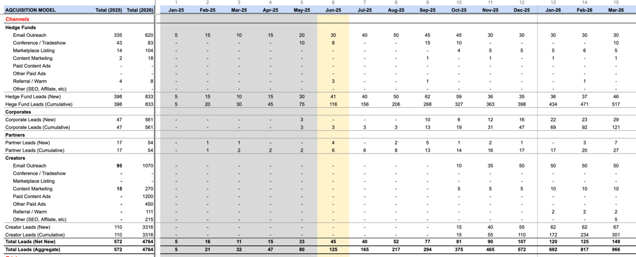 Acquisition Model: Modeling the revenue portion of the P&L is especially tricky. For this we have a dedicated “Acquisition Model” tab that takes assumptions about leads, conversion rates, and pricing to give us an even more granular view of future revenues (you can just as well put this on your Forecasts tab, but I find it better to keep separate, see below)