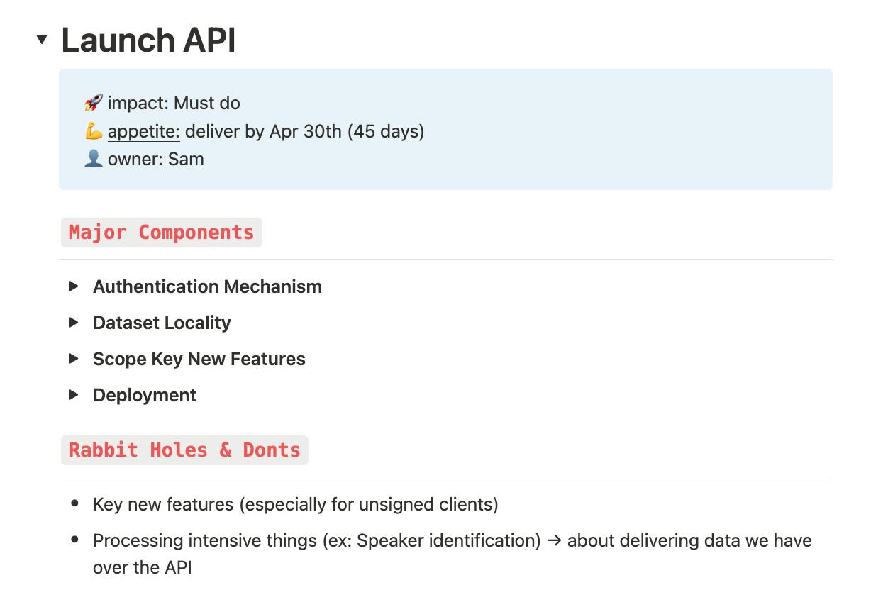 2 This is pretty directly from Basecamp’s Shape Up methodology, a gamechanger